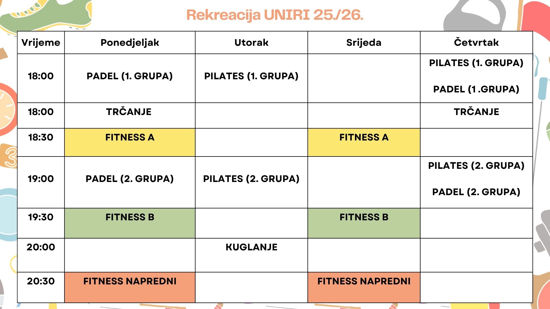 Fitness će se održavati u tri grupe ponedjeljkom i srijedom u razdoblju od 18.30 do 21.30 sati (svaka grupa po sat vremena).